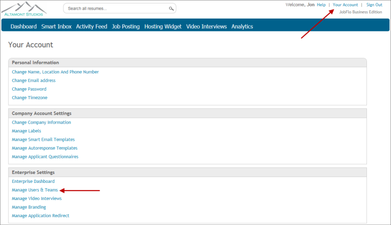 1. Click Your Account in the upper right corner, then Manage Users and Teams in the Enterprise Settings section.