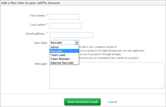 - Select Recruiter if the user will have ownership of one or more projects.